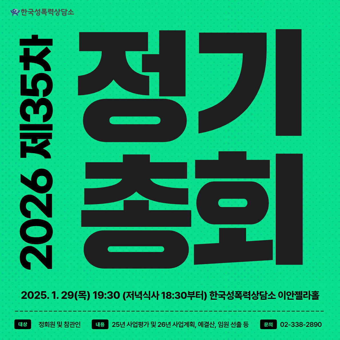 정기총회는 한국성폭력상담소 정관 제19조(총회 종류와 소집기일, 방법 등)에 따른 최고 의사결정기구로, 정회원이 참석하여 한국성폭력상담소의 목표와 사업 방향을 토론하고, 사업계획을 검토하고 승인하며, 임원선출 및 예산안 등의 안건을 함께 의결합니다.