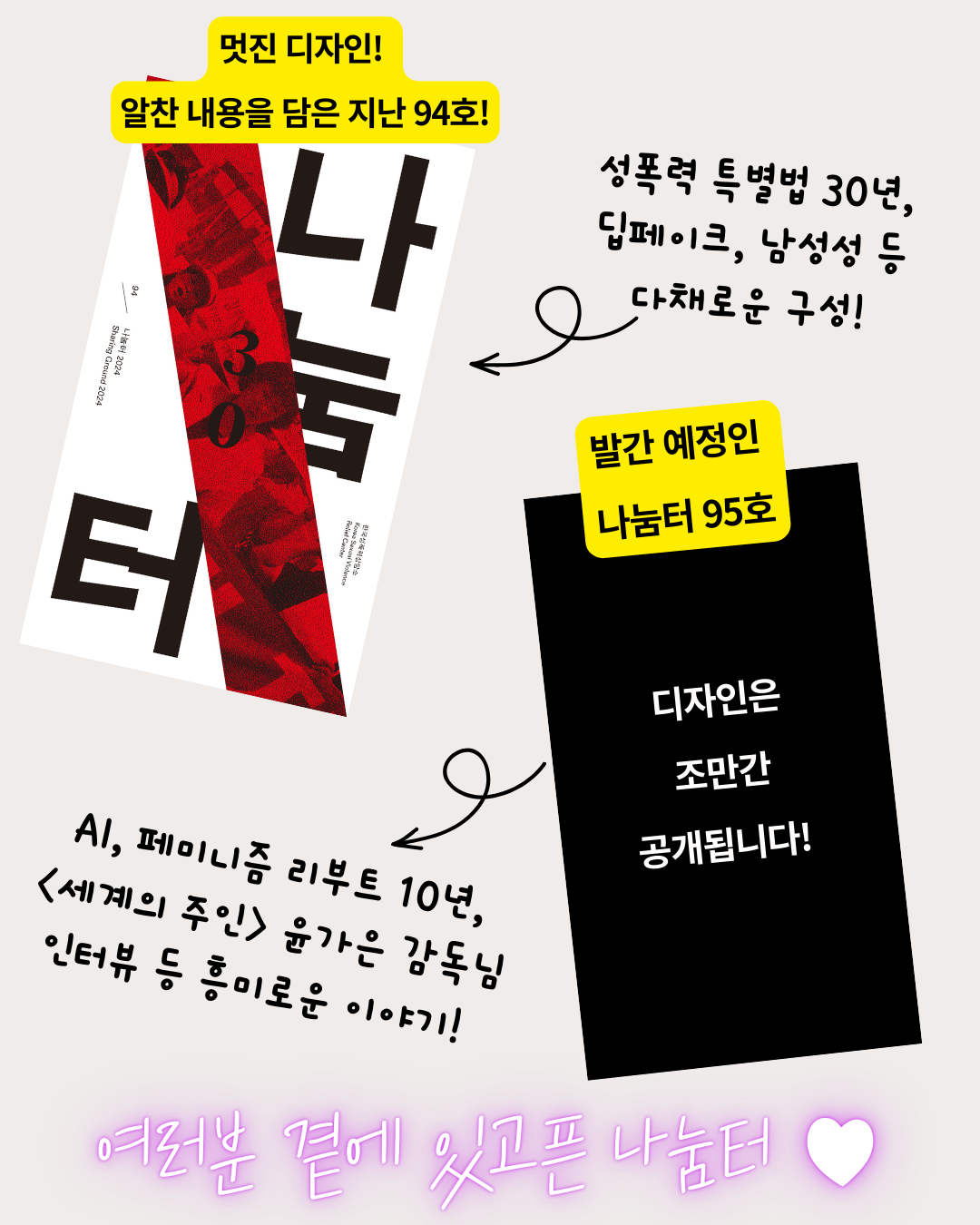 상담소의 다양한 활동을 더 잘 전달하기 위해 약 2년 전부터 준비해 온 개편은 상담소의 역동성과 활동가들의 에너지를 강조하려는 욕구가 있었습니다. 91년 창간호부터 지금까지의 나눔터를 살펴보며, 단순한 활동 소식지가 아닌, 상담소의 역동적인 모습을 잘 설명할 수 있는 기록물로서의 중요성을 다시금 확인하며, 익숙함을 유지하면서도 디자인과 목차를 정돈해 새로운 분위기를 선보이게 되었습니다. 과연 95호는 어떤 모습일까?