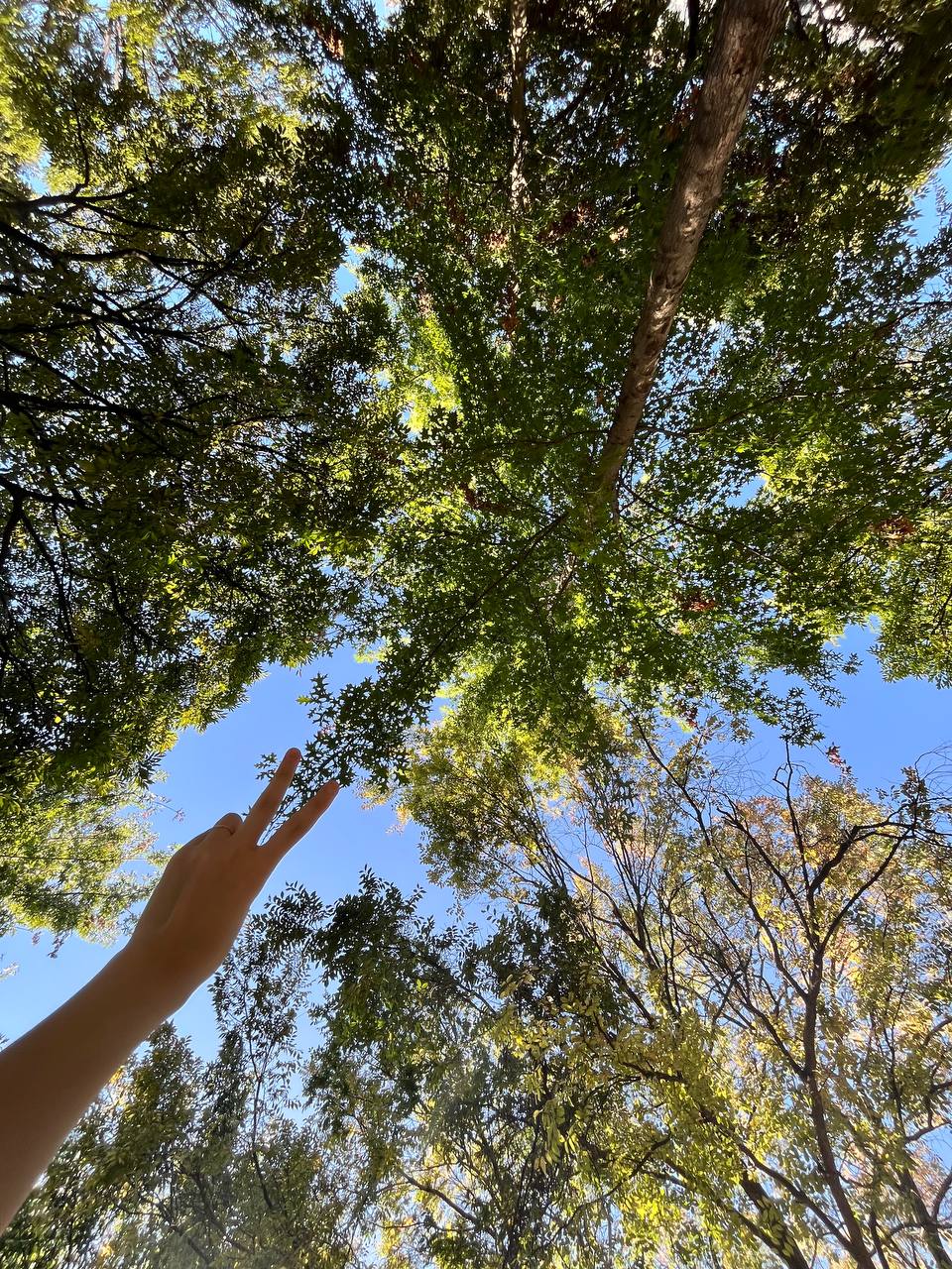 | 나무 아래에 누워 하늘 올려다보며 브이 V |