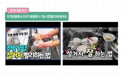 설거지를 생활교육 주제로 정한 건, 각자 설거지하는 방법이 조금씩 다르기도 하고, 가끔은 제대로 닦이지 않은 식기가 발견되기도 하기 때문입니다. 설거지하는 법에 대한 동영상들을 찾아보면서, 사실 저도 설거지 방법을 잘 모르고 대충 감으로 하고 있었다는 걸 알았어요. 설거지에도 조금 더 빠르고 깨끗하게 할 수 있는 꿀팁들이 있더라고요.